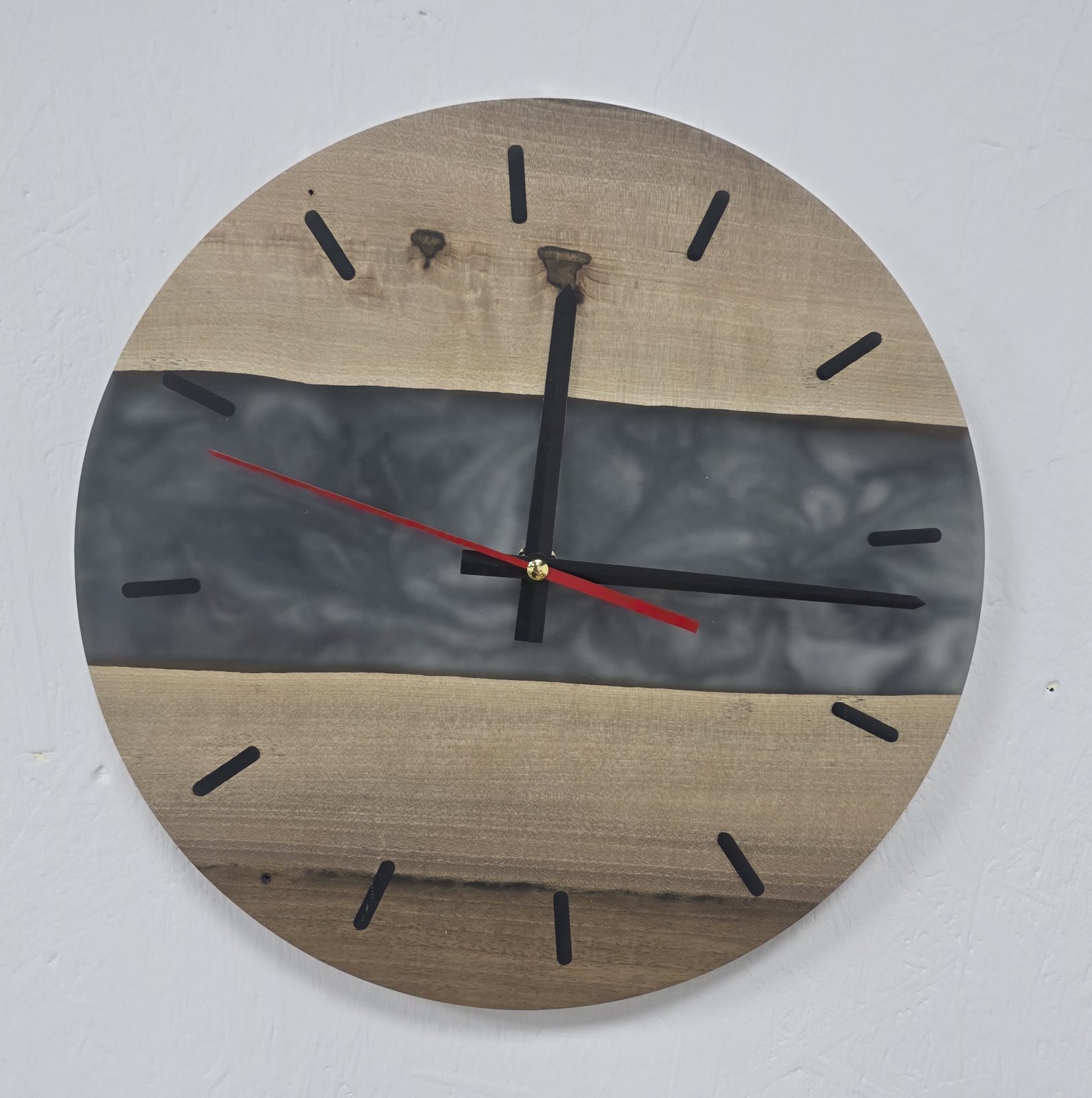 Естетика мінімалізму та природної краси. Поєднання фактурного горіха з напівпрозорою димчасто-сірою епоксидною смолою створює ефект легкого туману між берегами дерева. Червона секундна стрілка додає виробу динаміки та стає яскравим фінальним штрихом.Характеристики:Матеріал: Масив горіха з виразними річними кільцями.Декор: Епоксидна смола димчастого кольору з перламутровим ефектом. Діаметр: Ø 30 см . Лаконічні чорні мітки та акцентна червона стрілка.Покриття: Захисне масло-віск, що підкреслює шляхетність деревини.Ідеальний вибір для сучасного кабінету або вітальні. Створено майстернею «СМОЛЯРНЯ».