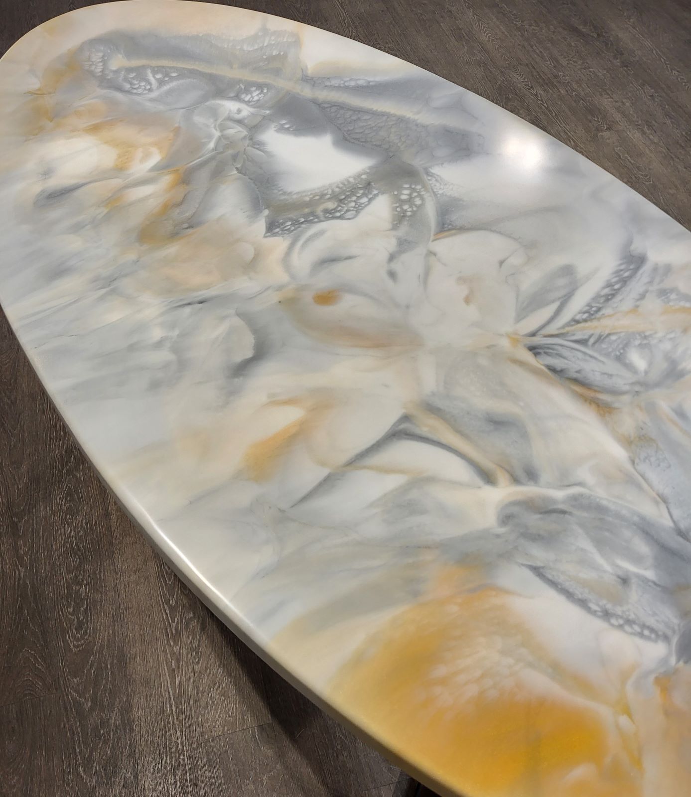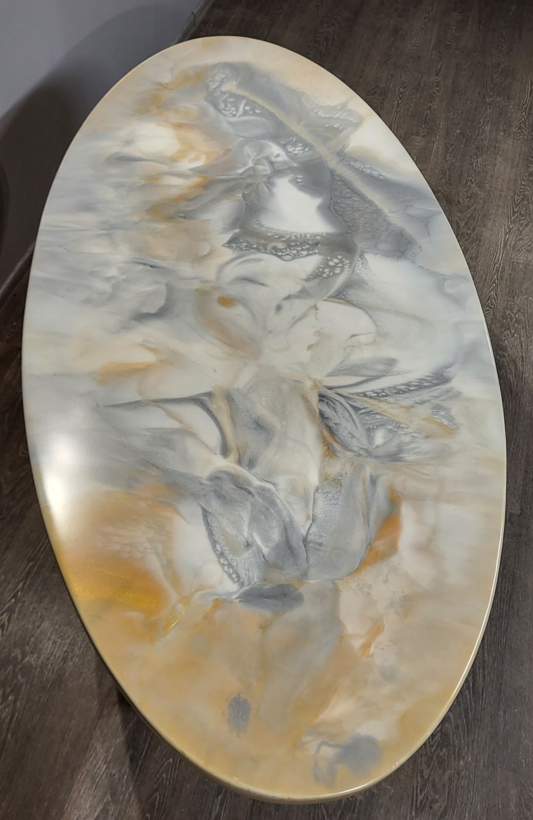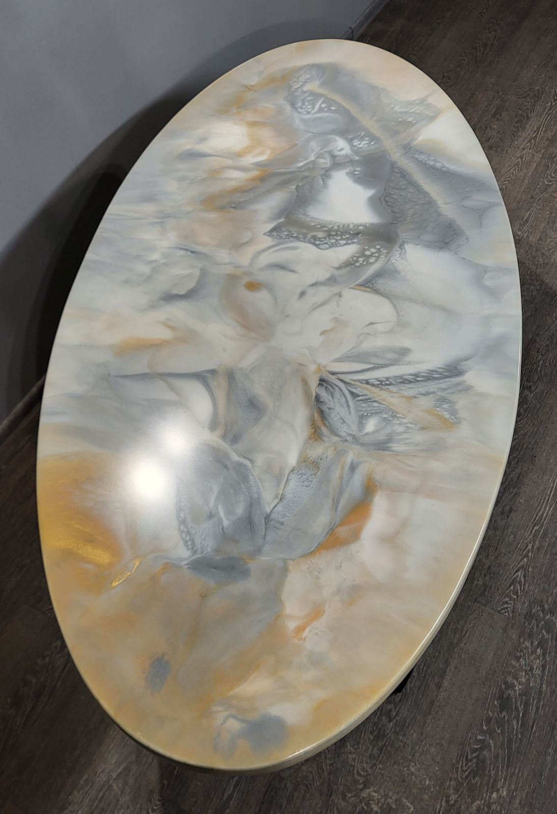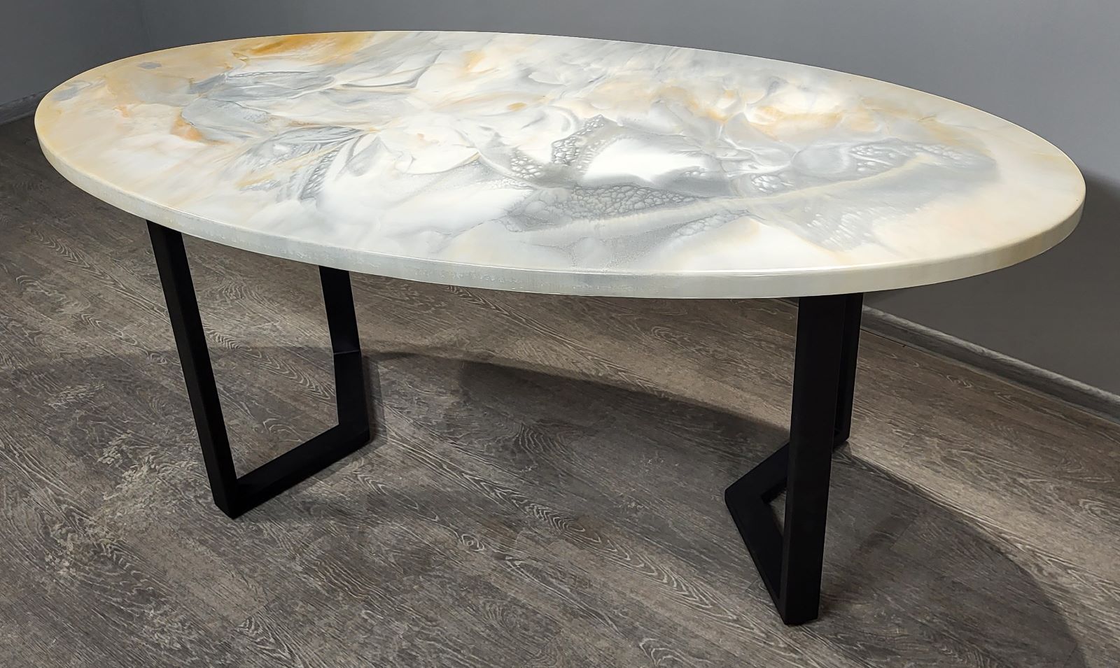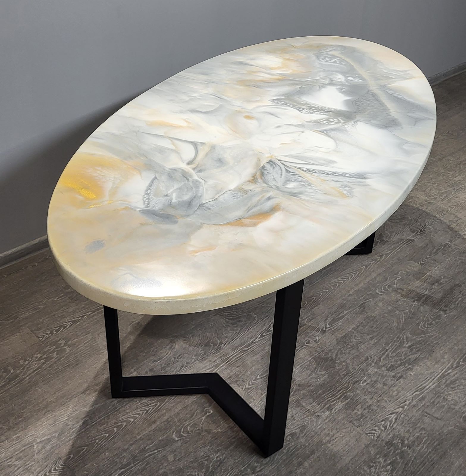 Стильний стіл, який виглядає як витвір сучасного мистецтва. Ми використали надійну основу з ДСП та перетворили її на унікальну дизайнерську річ за допомогою багатошарової заливки епоксидною смолою. Малюнок створюється вручну майстром, тому кожна деталь — неповторна. Технологія та переваги: Авторський дизайн: Ручний розпис епоксидною смолою, що створює глибину та складні візерунки. Захисне покриття: Зверху виріб вкритий додатковим прозорим шаром смоли та фінішним матовим (або напівматовим) лаком. Це робить поверхню стійкою до подряпин та приємною на дотик. Практичність: Основа з ДСП дозволяє зробити стіл доступним за ціною, зберігаючи при цьому візуальну розкіш дорогих матеріалів. Характеристики: Покриття: Епоксидна смола + захисний лак. Основа: Плита ДСП високої щільності. Опори: Металеві ніжки в стилі Loft. Розмір: 180*90см. Ідеальний вибір для тих, хто шукає ексклюзив за розумні гроші. Зроблено з душею в майстерні «СМОЛЯРНЯ».