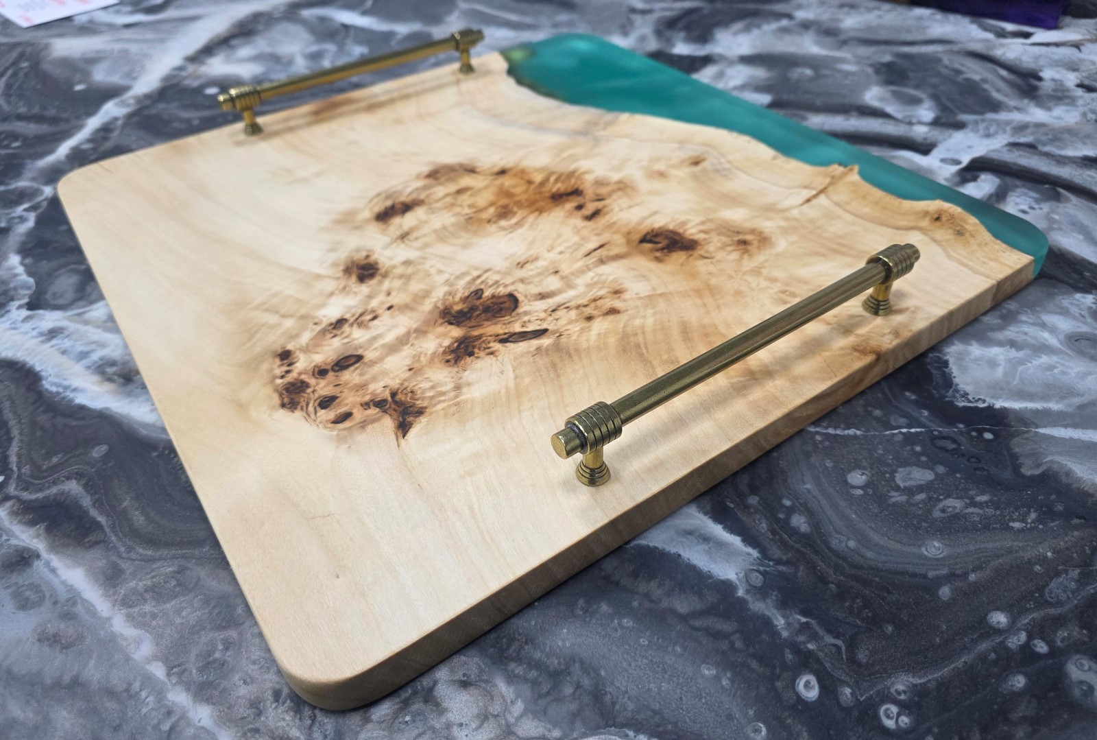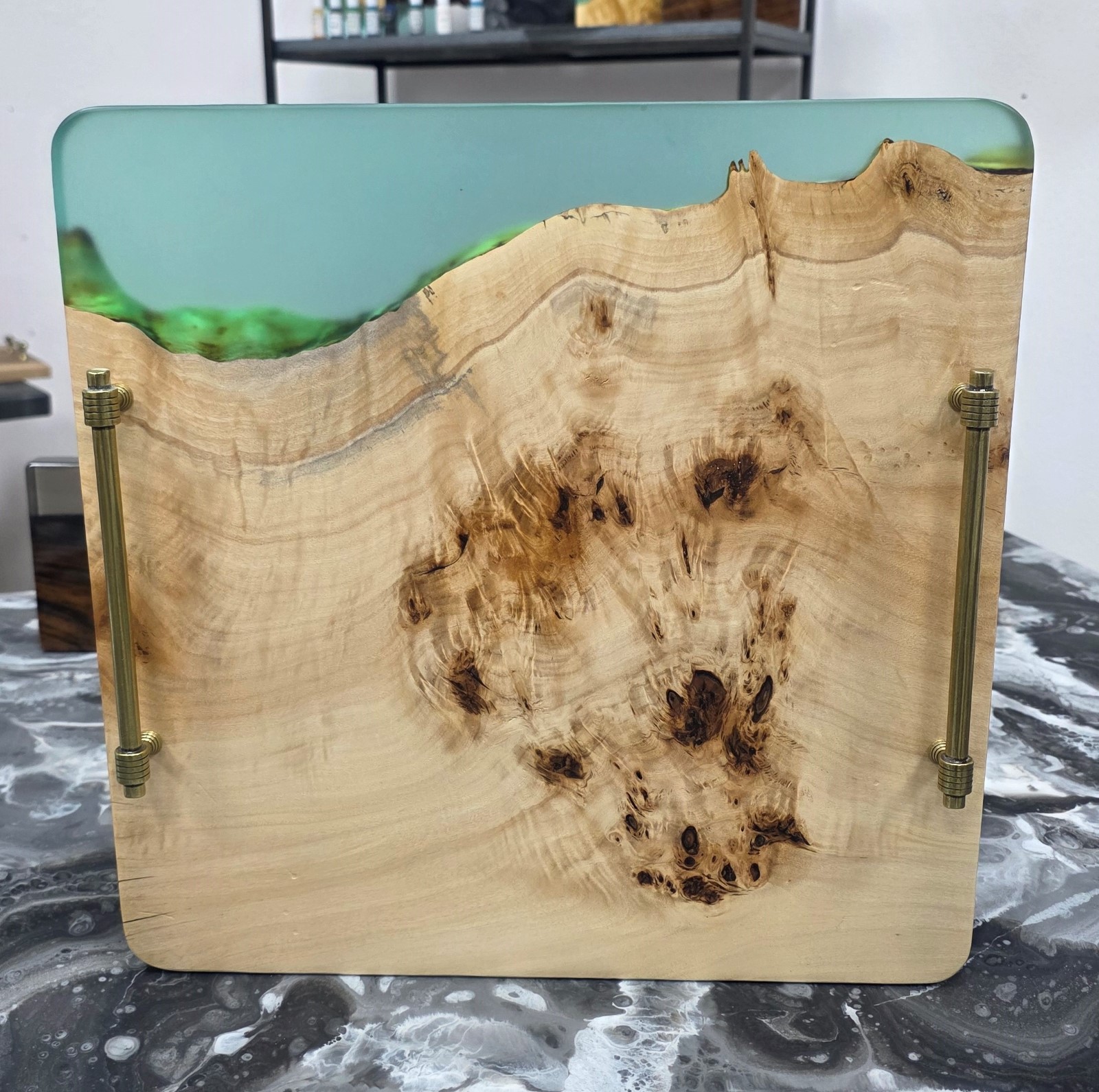 Ексклюзивна таця ручної роботи, виготовлена з масиву тополі та високоякісної епоксидної смоли. Унікальний природний малюнок дерева підкреслено глибоким кольором заливки. Поверхня захищена екологічним маслом, що дозволяє безпечний контакт із харчовими продуктами. Ідеально підходить для стильної подачі сніданків або як акцентний елемент декору у вашому домі. Виготовлено в майстерні «СМОЛЯРНЯ. Розміри 40*40см