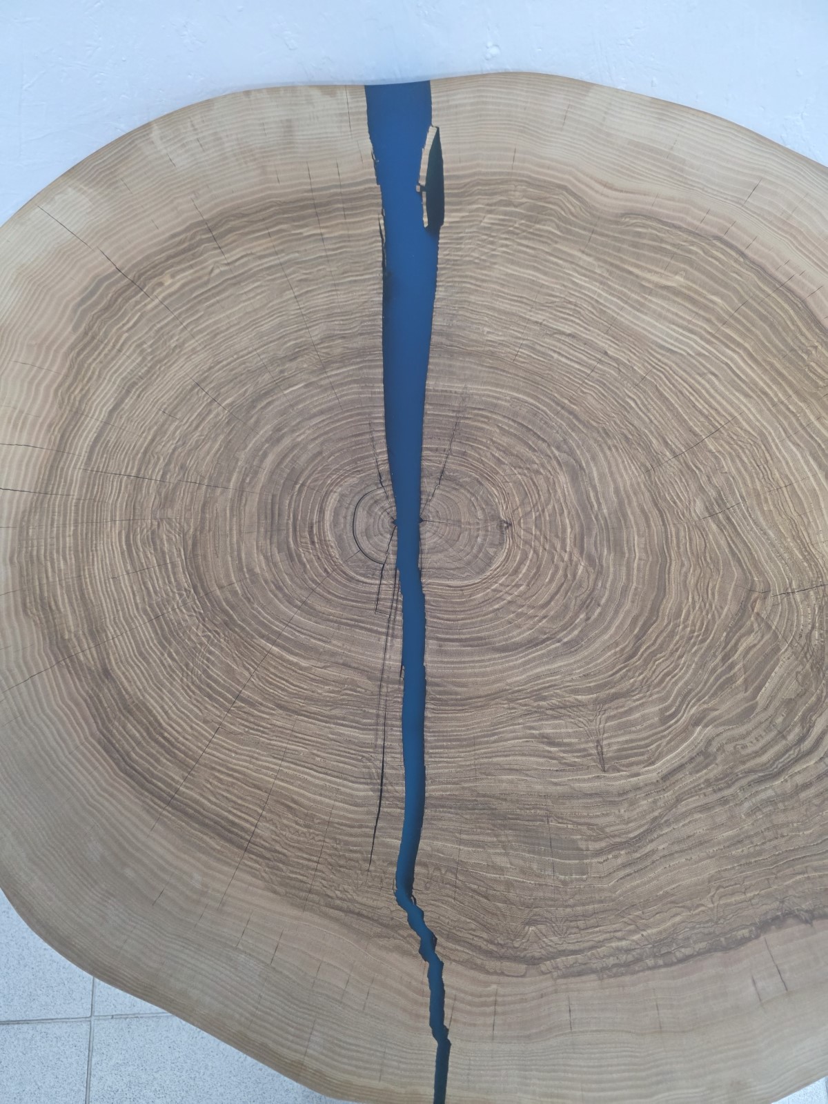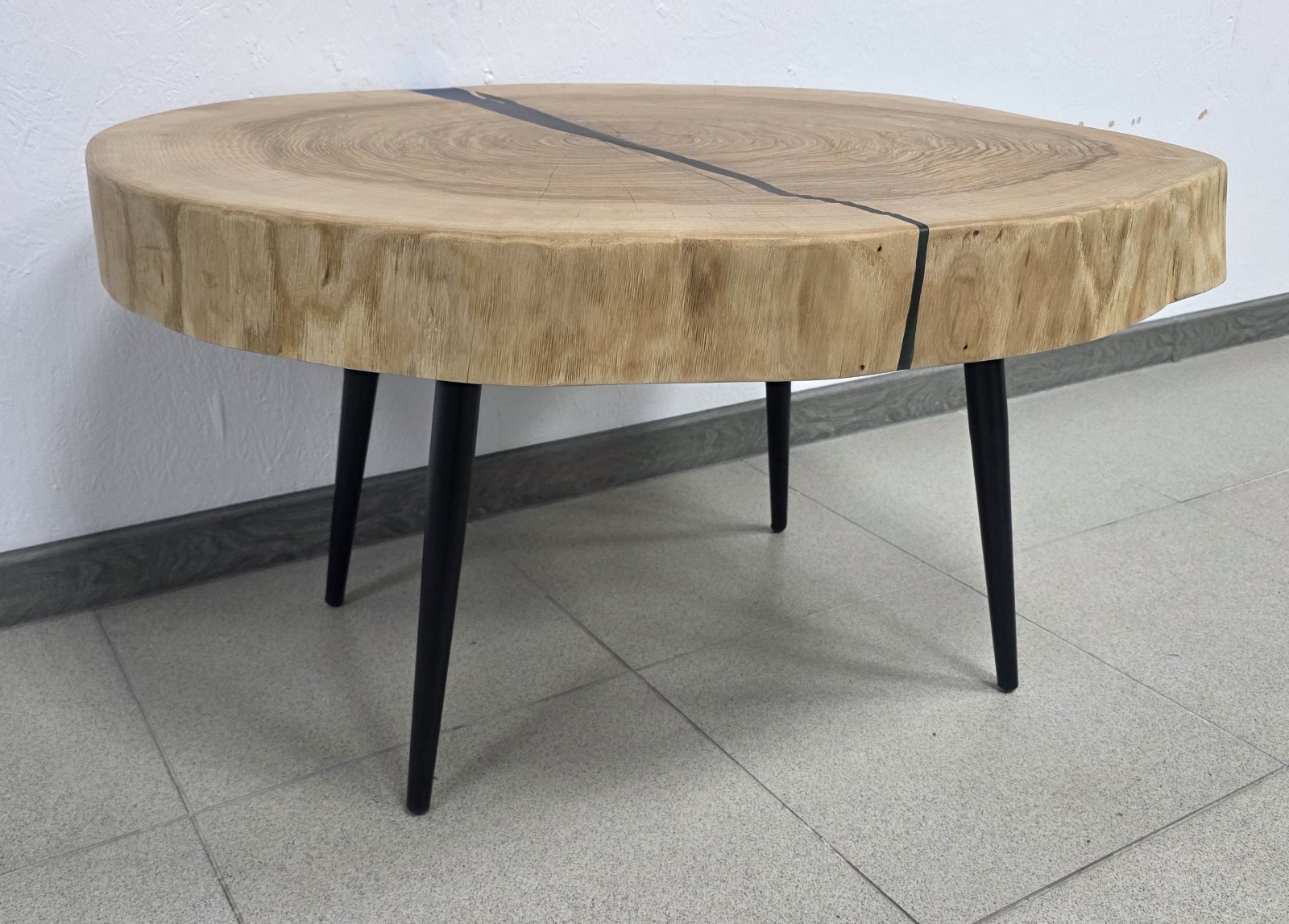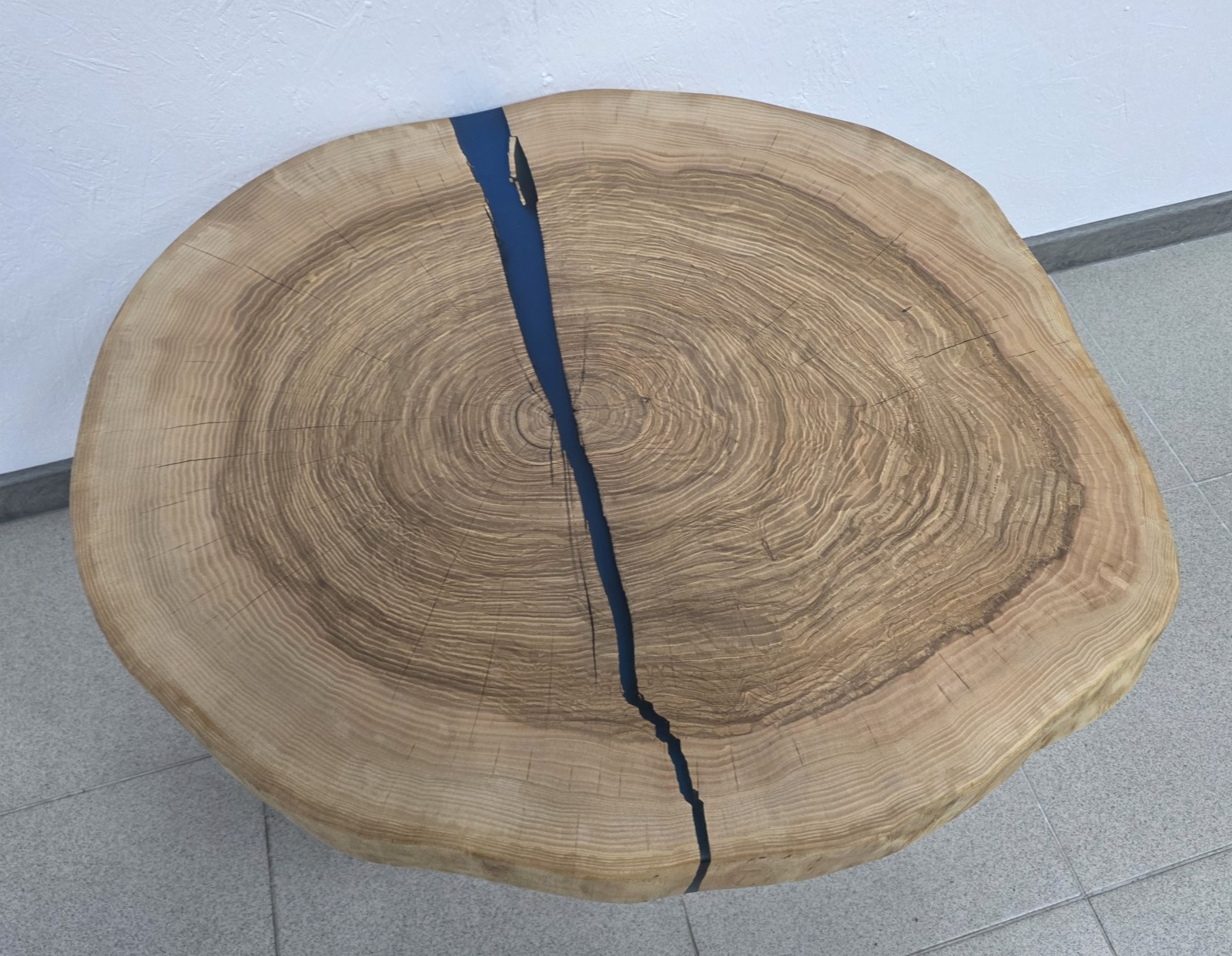 Цей стіл — втілення природної міцності та лаконічного дизайну. Виготовлений із цілісного зрізу ясеня, він зберігає унікальну текстуру дерева, яку неможливо повторити. Ясен відомий своєю твердістю та виразним малюнком річних кілець, що робить кожен такий стіл єдиним у своєму роді. Тонка лінія епоксидної смоли підкреслює природну тріщину, перетворюючи особливість дерева на стильний акцент. Основні характеристики: Матеріал: Натуральний масив ясеня. Оздоблення: Тонка заливка епоксидною смолою глибокого темного кольору. Покриття: Поверхня захищена екологічним маслом-воском, що підкреслює тепло деревини та захищає її від вологи. Опори: Металеві ніжки в стилі Loft, вкриті чорною матовою фарбою, забезпечують стійкість та сучасний вигляд. Чому цей стіл підійде саме вам? Він ідеально доповнить зону відпочинку у вітальні або стане акцентним елементом у вашому офісі. Завдяки високій щільності ясеня, такий стіл служитиме десятиліттями, з часом стаючи лише ціннішим. Виготовлено в майстерні «СМОЛЯРНЯ» — ми створюємо речі, які мають душу.